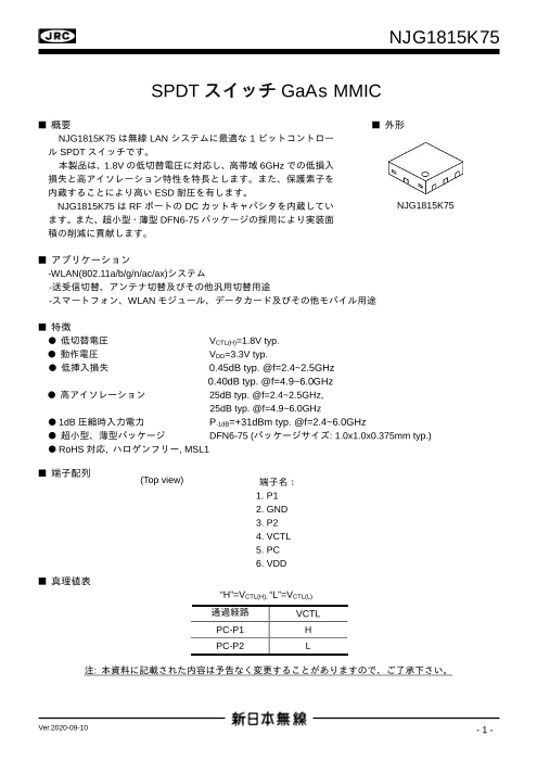 NJG1815K75は無線LANシステムに最適な1ビットコントロール SPDTスイッチです。