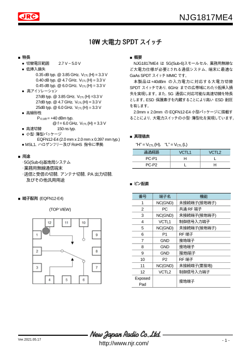 NJG1817ME4 は 5G(Sub-6)スモールセル、業務用無線な ど大電力仕様が必要とされる通...