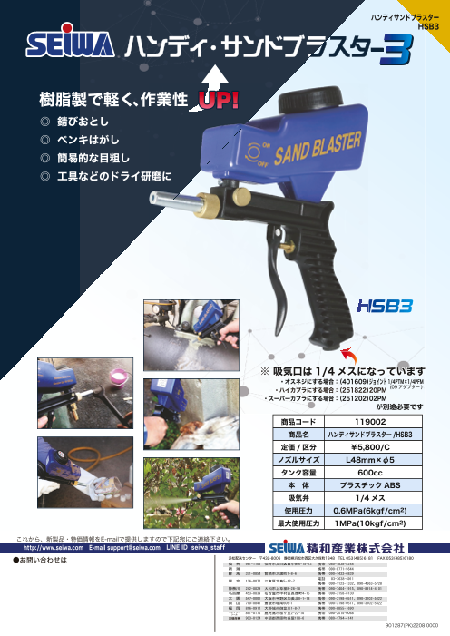 小型のハンディーサンドブラスター錆落とし、ペンキはがし、簡易的な目粗し、工具等のドライ研磨に軽量で握りやすく、ONとOFFのスイッチで作業性もアップ!