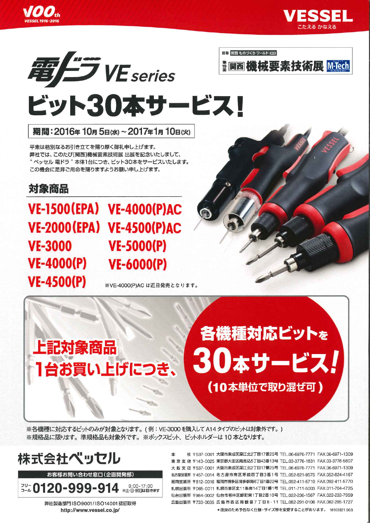 平素は格別なるお引き立てを賜り厚くお礼申し上げます。弊社では、このたび[関西]機械要素技術展 出展を記念いたしまして、”ベッセル 電ドラ”本体1台につき、ビット30本を...