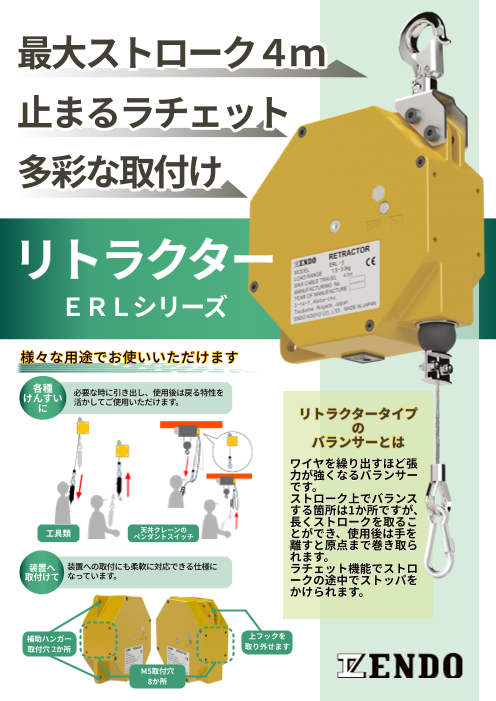 リトラクターはワイヤーを引き出すに連れて張力が強くなる機器ですERLシリーズの特長・容量1.5〜11.0kg・ストローク最⼤4.0メートル・ワイヤの引き出し可能⻑さは張⼒...