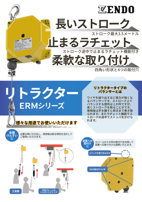 リトラクターはワイヤーを引き出すに連れて張力が強くなる機器ですERMシリーズの特長・容量1.0〜8.0kg・ストローク最⼤3.5メートル・ワイヤの引き出し可能⻑さは張⼒...