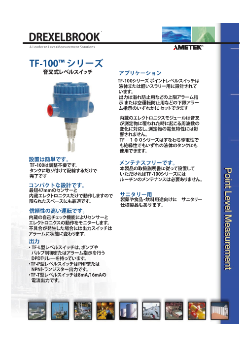 T F-100シリーズポイントレベルスイッチは液体または軽いスラリー用に設計されていま...