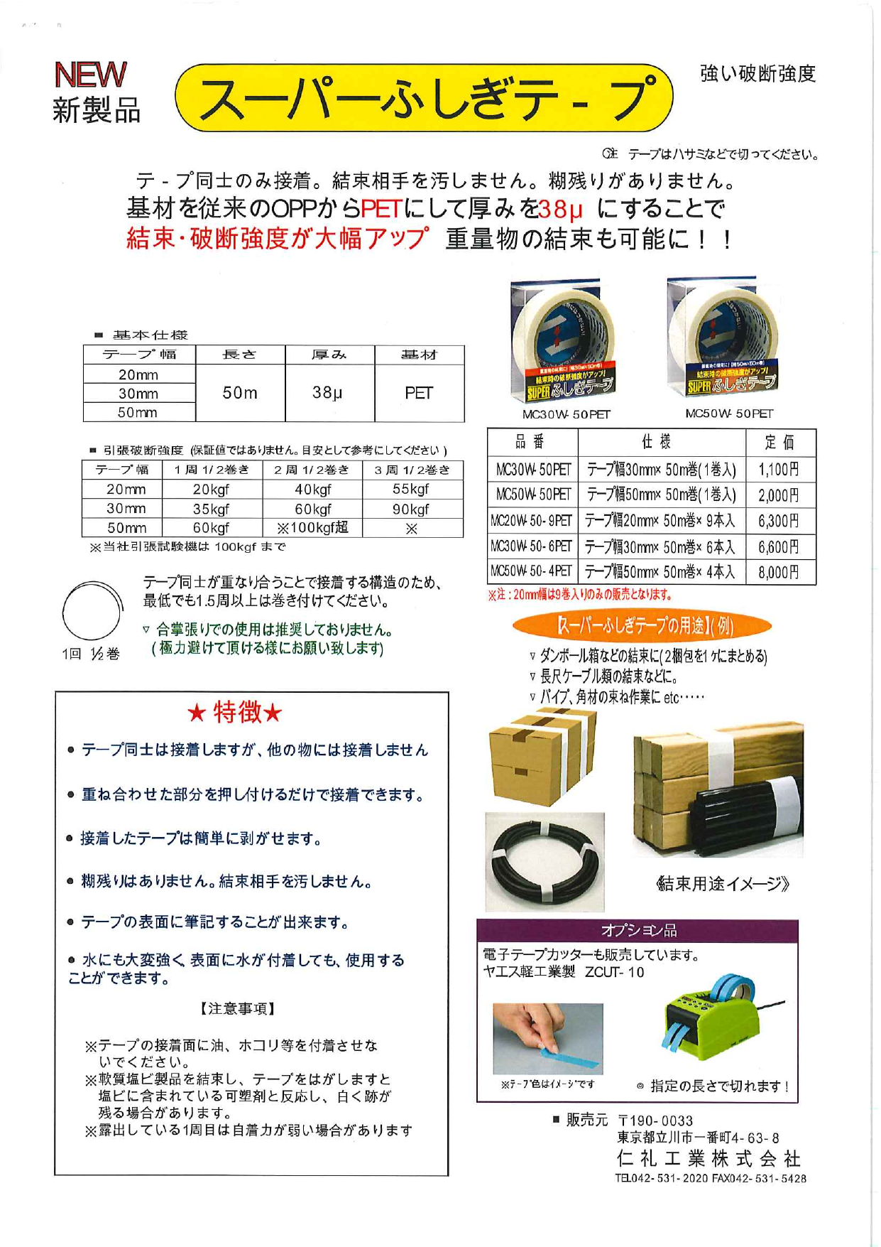 テープ同士のみ接着。結束相手を汚しません。糊残りがありません。基材を従来のOPPからPETにして厚みを38μにすることで結束・破断強度が大幅アップ 重量物の結束も可能に!!