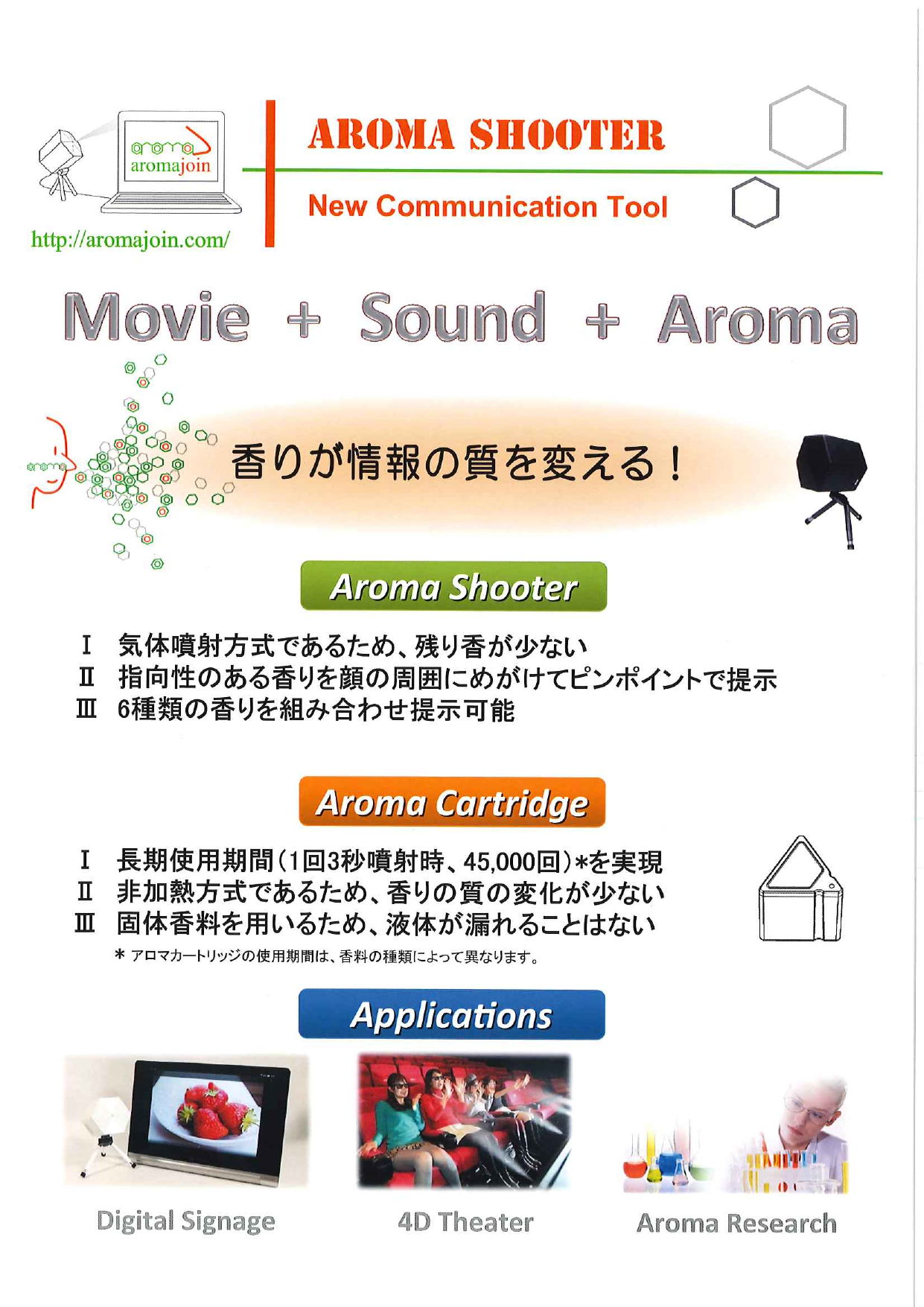 アロマシューターは200種類を超えるアロマカートリッジ(香源)から選択した任意の6個まで装填することができその6種類の香りを単独または調合(ブレンド)して提示(噴射)する...