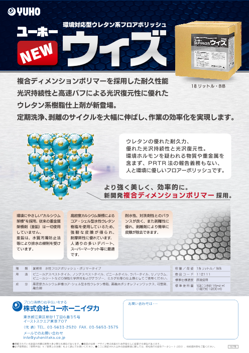 ◆複合ディメンションポリマーを採用した耐久性能光沢持続性と高速バフによる光沢復元性に優れたウレタン系樹脂仕上剤が新登場。◆定期洗浄、剥離のサイクルを大幅に伸ばし、作...
