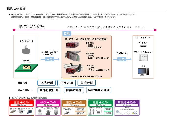 ■ RRシリーズを、ポテンショメータ等のセンサからの抵抗値をCANに変換する信号変換器、CANシグナルコンディショナとして使用できます。 自動車開発や、建機、産業機器等、CAN通信への信号変換器としてご利用いただけます。【計測でできること】■ フォークリ...
