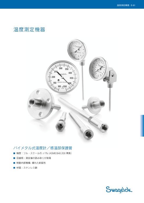Swagelok温度計は、らせん状に巻いたバイメタル(膨張率の異なる2枚の金属板を張り合わせたもの)を利用して温度を測定します。シリコーン・フリーのゲルで振動を吸収し、ASMEB4...
