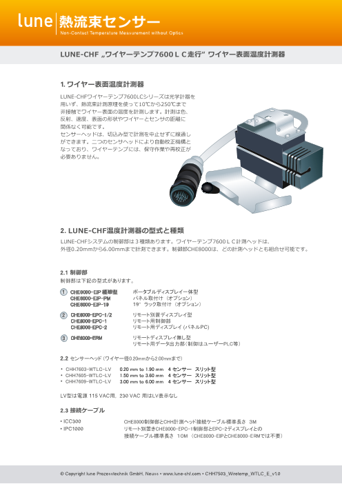 LUNE-CHFワイヤーテンプ7600LCシリーズは光学計器を用いず、熱流束計測原理を使って10℃から250℃まで非接触でワイヤー表面の温度を計測します。計測は色、反射、速度、表面の形状...