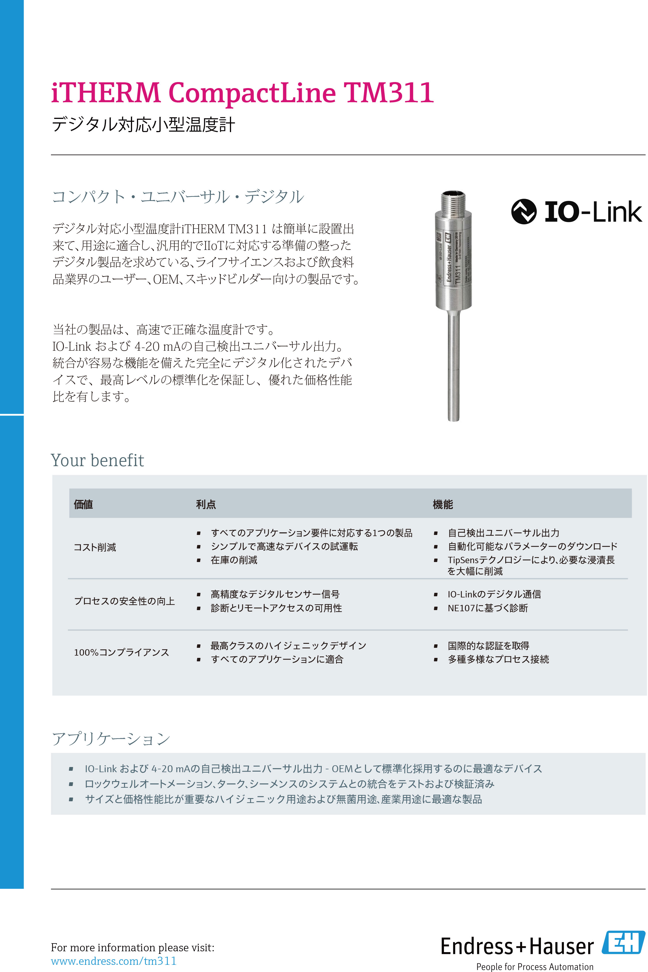 Endress+Hauserは、食品・飲料産業やライフサイエンス産業に最適な温度計を提供いたします。◆メンテナンス性の飛躍的向上を実現するQuickNeck対応のTM411◆高い測定信頼性が求められる重要アプリケーションに自動構成機能を備えたTrustSens TM371◆コンパクトな...