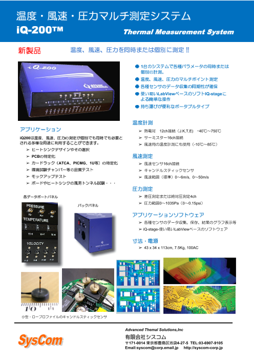 ●1台のシステムで各種パラメータの同時または個別の計測。●温度、風速、圧力のマルチポイント測定●各種センサのデータ収集の同期性が確保●使い易いLabViewベースのソフトI...