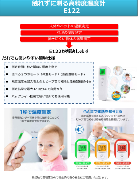 人体やペットの温度測定、料理の温度測定、届きにくい物体の温度測定 ⇒ E122が解決します◼測定時間1秒と瞬時に温度を測定◼選べる2つのモード(体温モード)(表面温度モー...