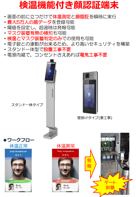 ・画面の前に立つだけで体温測定と顔認証を瞬時に実行・最大5万人の顔データを登録可能・閾値を設定し、超過時は発報可能・マスク装着有無の検知も可能・検温とマスク装...