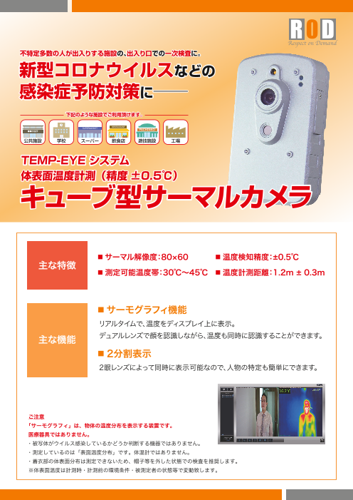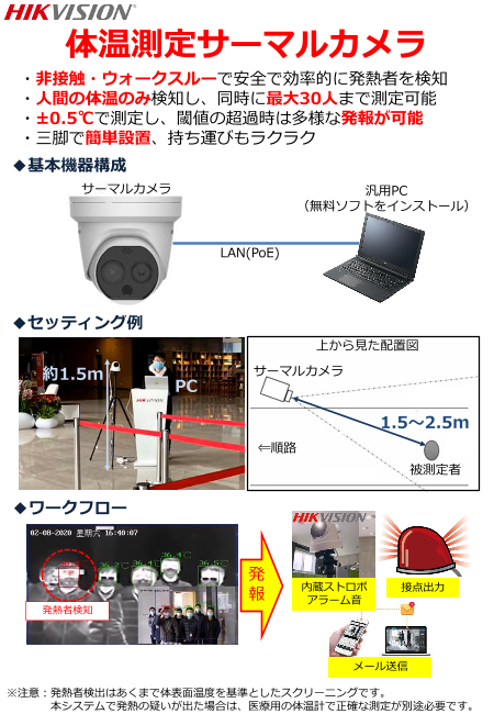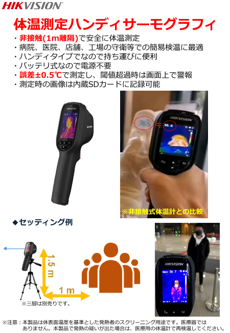 ・人間の体温のみ検知し、同時に最大30人まで測定可能・±0.5℃で測定し、閾値の超過時は多様な発報が可能・三脚で簡単設置、持ち運びもラクラク