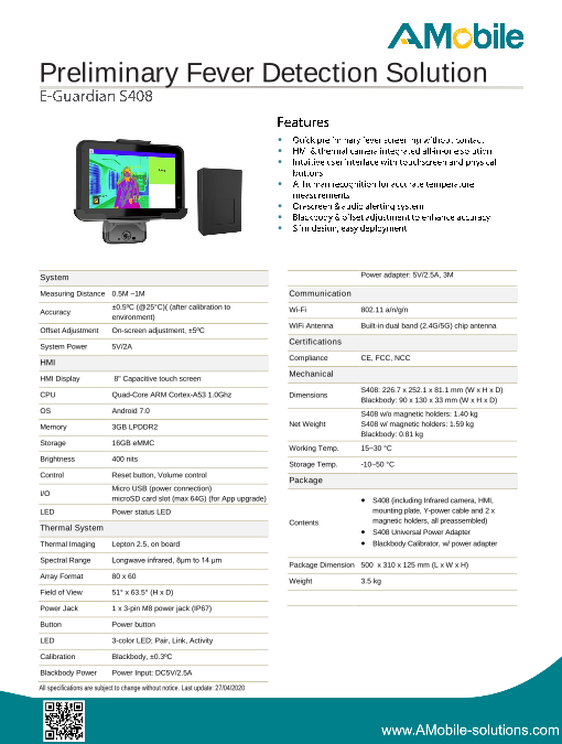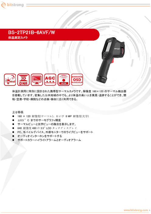 主な特徴■ サーマル解像度:80×60■ 温度検知精度:±0.5℃■ 測定可能温度帯:30℃~45℃■ 温度計測距離:1.2m ± 0.3m主な機能■ サーモグラフィ機能リアルタイムで、...