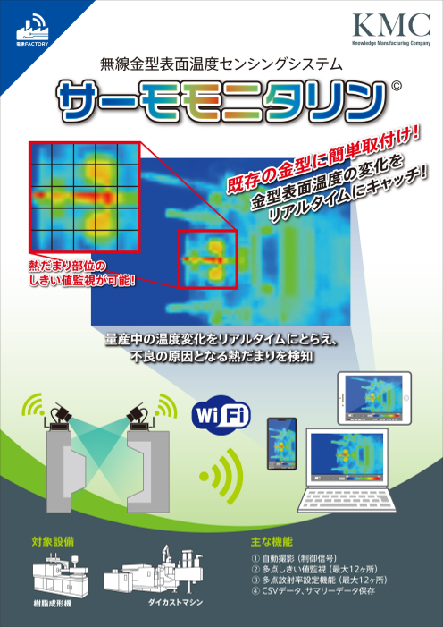 KMCの「サーモモニタリン」は、無線式の赤外線サーモカメラでワンショットごとの金型表面温度を自動で撮影!表面温度を定期的にモニタリングすることで、金型の冷却効率の監視か...