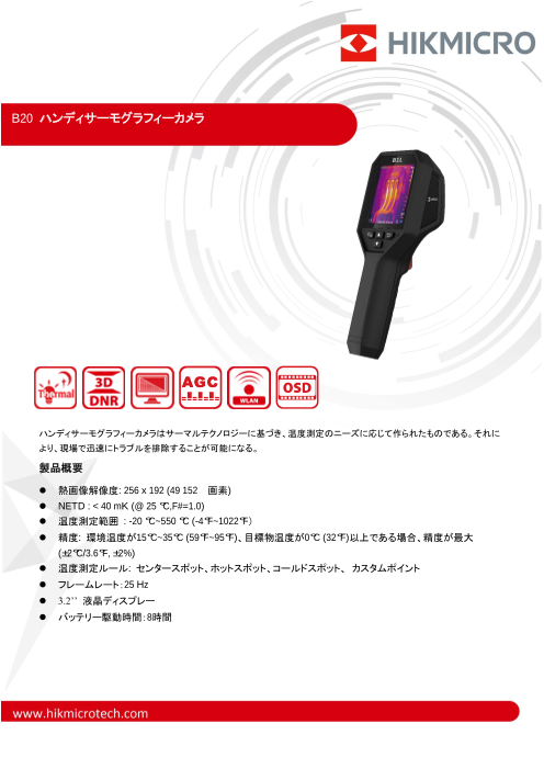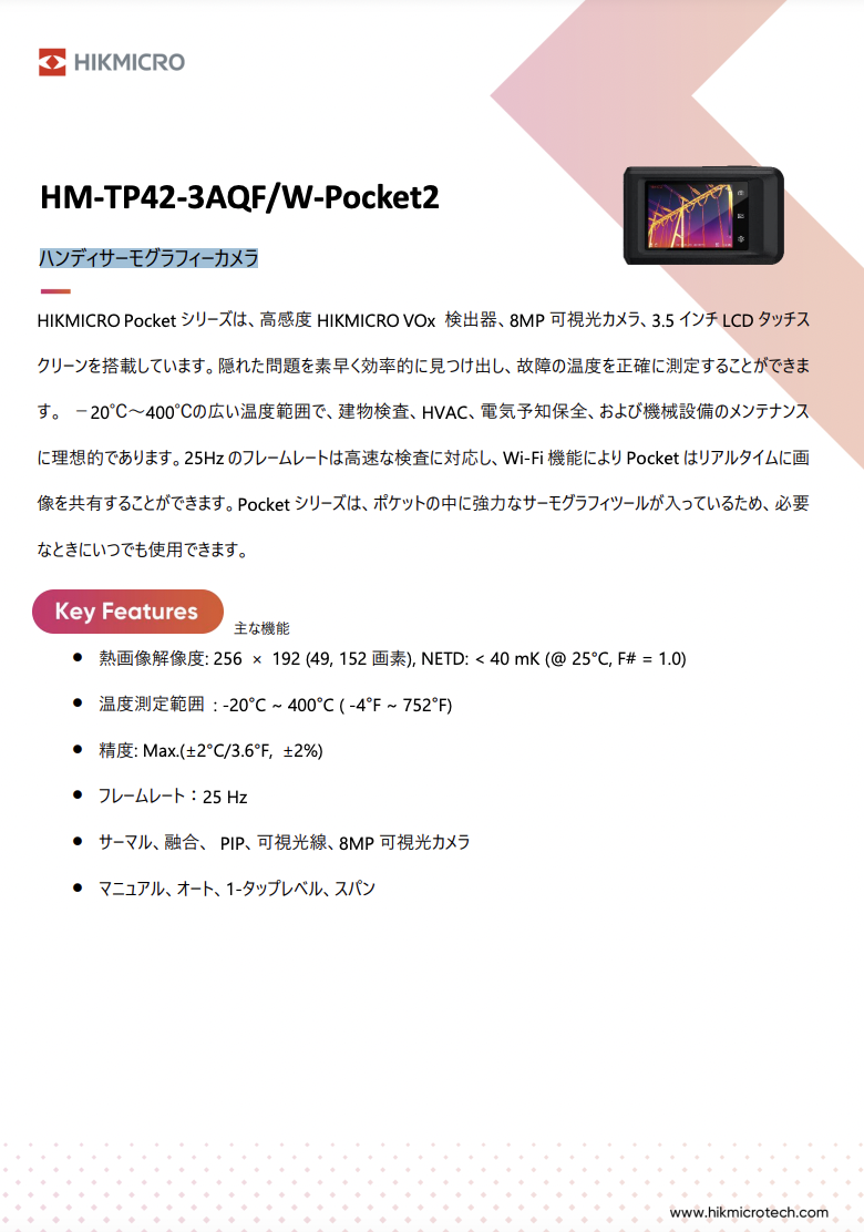 【特長】・解像度256x192 VOx非冷却サーマルセンサー・アサーマルレンズ(サーマルカメラ)、フォーカス・フリー・ストロボとオーディオのスマートリンケージ・測定精度...