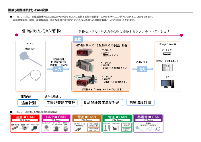 ■ HT-Rシリーズは、測温抵抗体Pt100(3線式)の信号をCANに変換する信号変換器、CANシグナルコンディショナとして使用できます。 自動車開発や、建機、産業機器等、様々に、CAN通信への信号変換器としてご利用いただけます。【計測でできること】■ 工場の配...