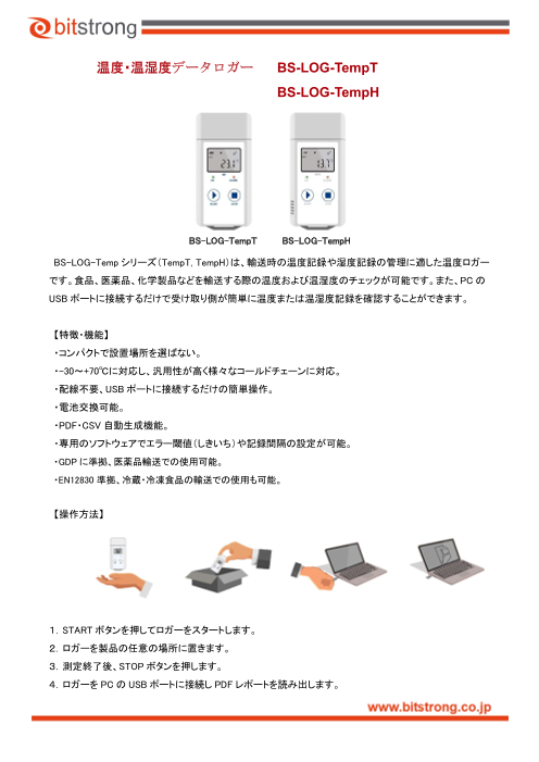 ・コンパクトで設置場所を選ばない。・電池交換可能。 ・温度のみの記録タイプ(T)と温度湿度記録タイプ(H)の2機種。・GDP に準拠、医薬品輸送での使用可能。・EN12830 準拠、冷蔵・冷凍食品の輸送での使用も可能。