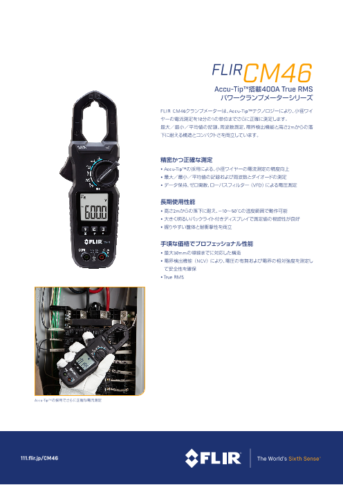 FLIR CM4 6 クランプメーターは、Accu -TipTMテクノロジーにより、小径ワイ ヤーの電流測定を1 0 分の1 の単位までさらに正確に測定します。 最大/最小/平均値の記録、周...