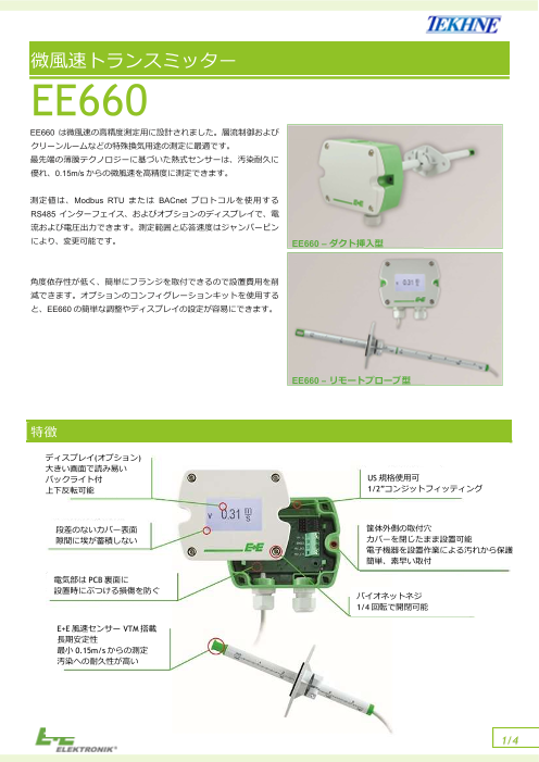 ● 測定範囲0~2 m/ sでクリーンルームなどの微風速測定に【EE660】● 優れた長期安定性と耐汚染性● 本体ジャンパーピンで測定範囲、出力信号、応答速を選択可能● 角度...