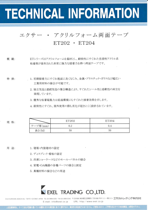 1.アクリル系特殊粘着剤の採用により、従来にない抜群の接着力を発揮します。2.金属・プラスチック・ゴム等幅広い工業用材料の接着に安定した性能を保持し、ポリエチレン・ポ...