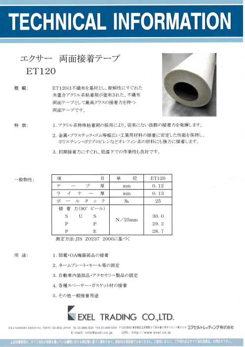 ET120は不織布を基材とし、耐候性にすぐれた共重合アクリル系粘着剤が塗布された、不...