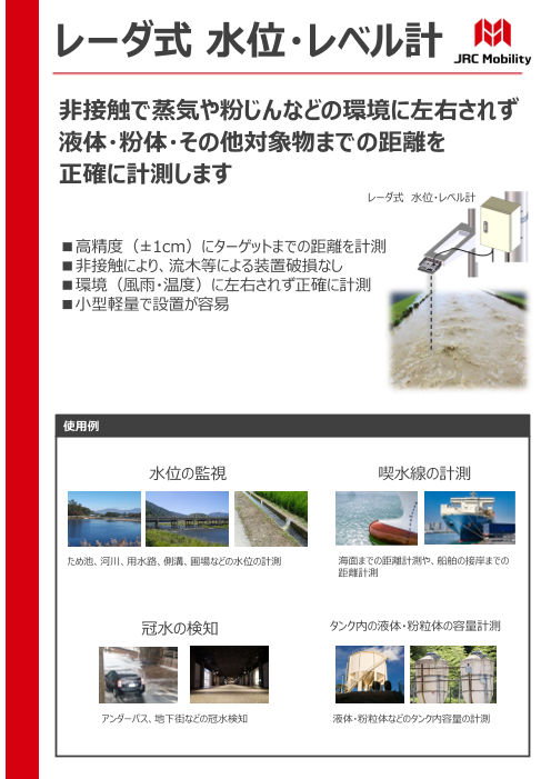『レーダ式 水位・レベル計』は、非接触で環境に左右されず水位・液面・その他の対象物までの距離を正確に計測します。水位などの距離を高精度に計測し、小型で軽量なので...