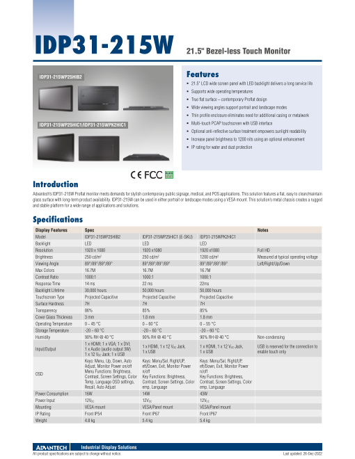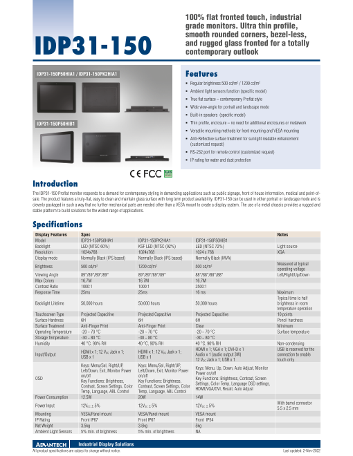 モデル IDP31-150P50HIA1バックライト LED解像度 1920 x 1080輝度 1200 cd/m2アングル 89°/89°/89°/89°カラー 16.7Mコントラスト比 1000:1反応速度 22msバック...