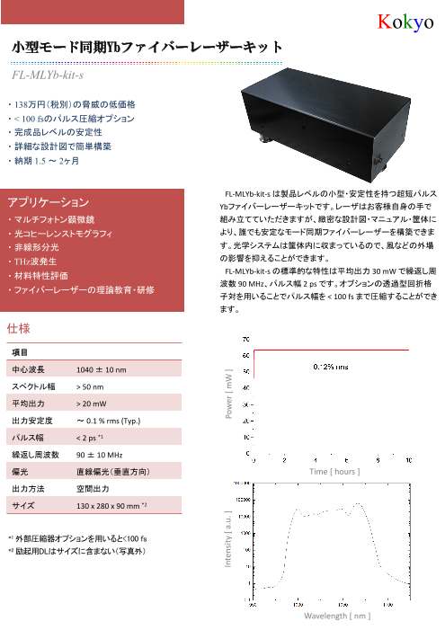 【特徴】○< 100 fsのパルス圧縮オプション○完成品レベルの安定性○詳細な設計図で簡単構築○光ファイバー融着器の無料貸し出し可
