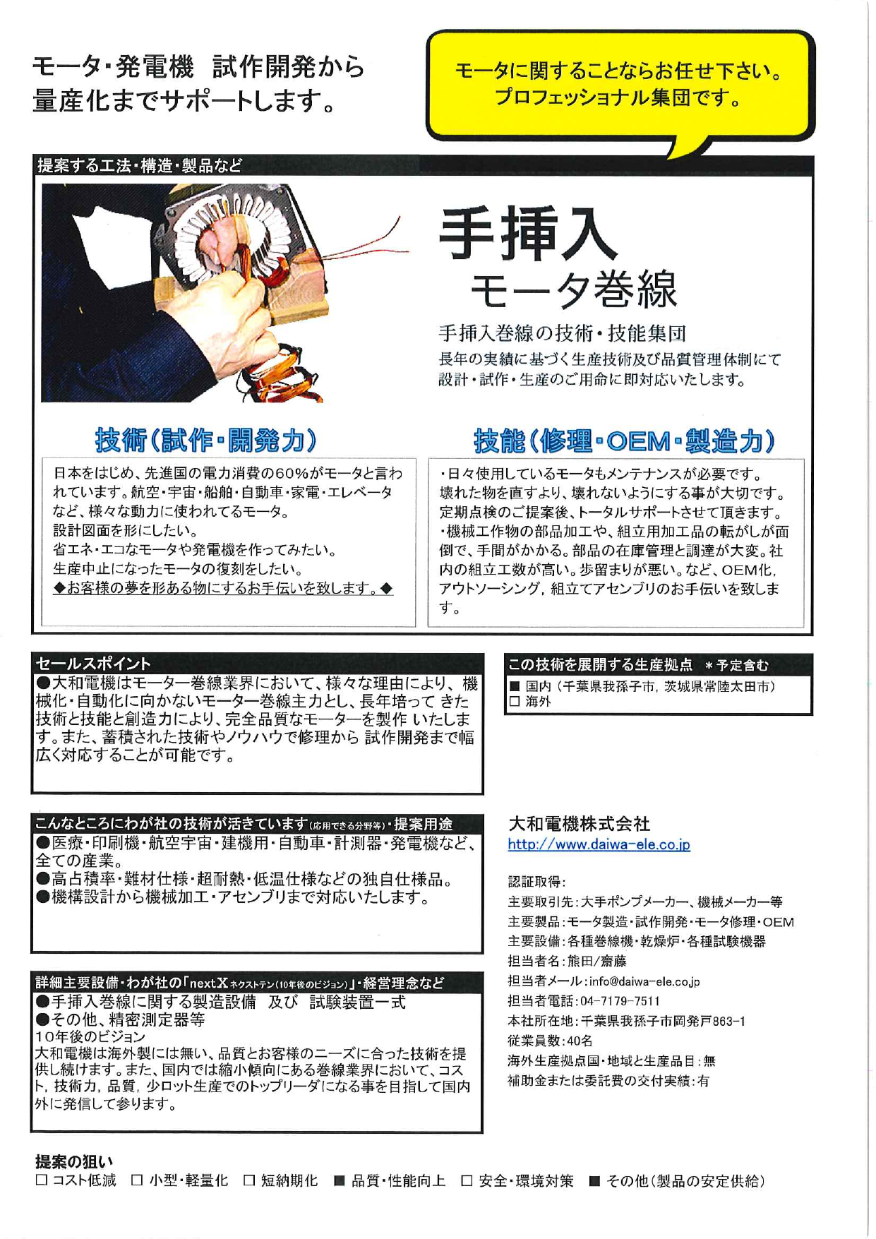 モーター巻線業界において、様々な理由により、機械化、自動化に向かないモーター巻線主力とし、長年培ってきた技術と技能の創造力により、完全品質なモーターを製作いたします。