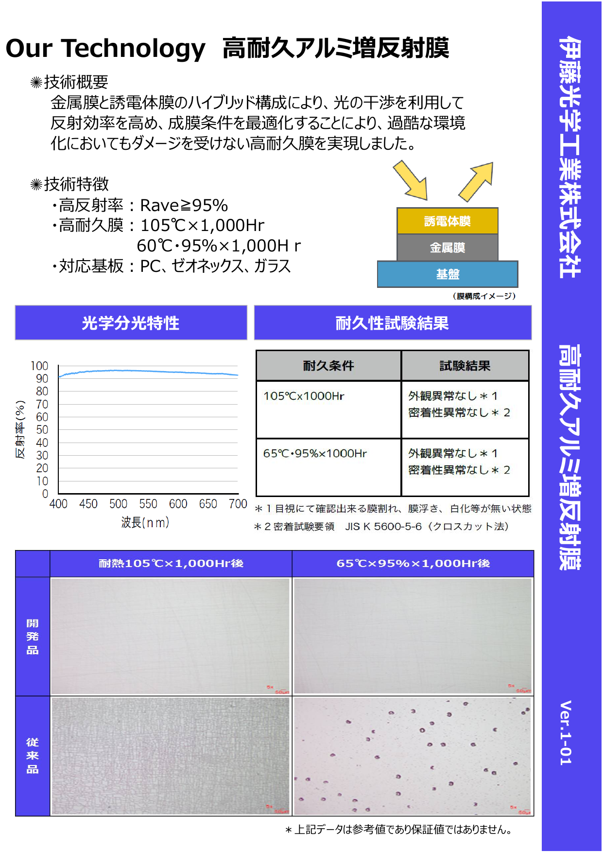 金属膜と誘電体膜のハイブリッド構成により、光の干渉を利用して反射効率を高め、成膜条件を最適化することにより、過酷な環境化においてもダメージを受けない高耐久膜を実現し...