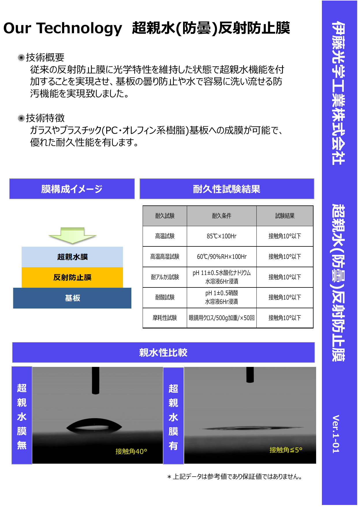 従来の反射防止膜に光学特性を維持した状態で超親水機能を付加することを実現させ、基板の曇り防止や水で容易に洗い流せる防汚機能を実現致しました。◆詳細はカタログをダウ...