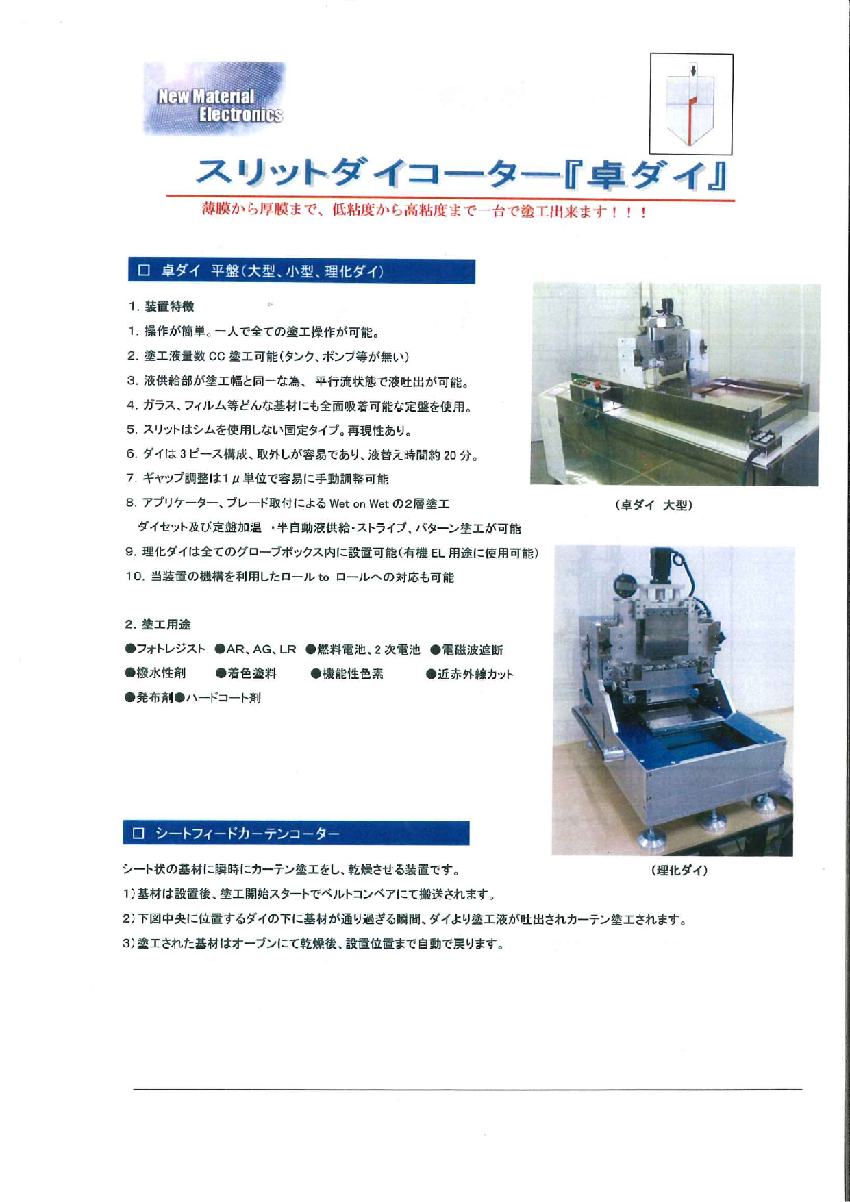 1.操作が簡単。一人で全ての塗工操作が可能。2.塗工液量数CC塗工可能(タンク、ポンプ等が無い)3.液供給部が塗工幅と同一な為、平行流状態で液吐出が可能。4.ガラス、フ...