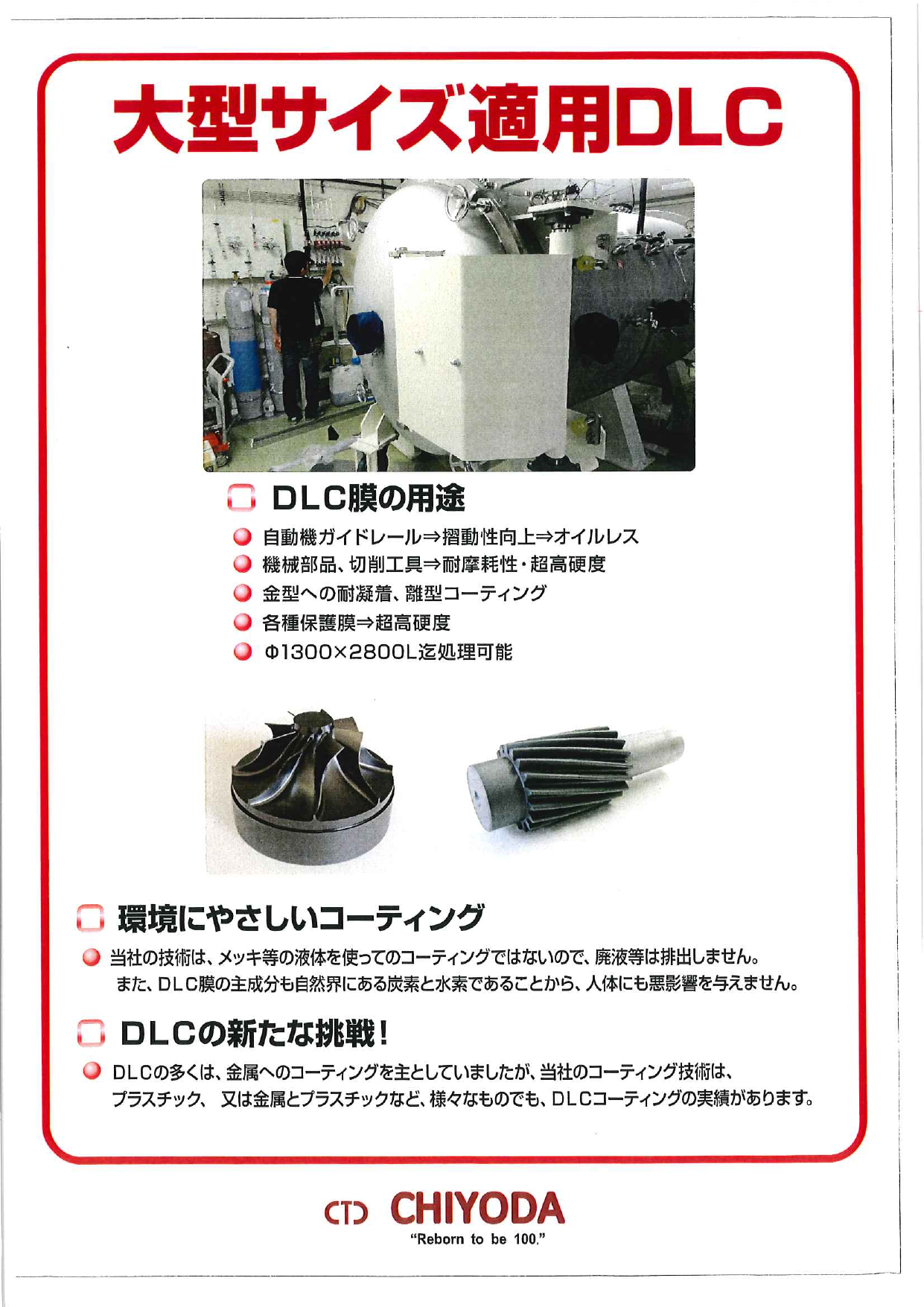 ・当社の技術は、メッキ等の液体を使ってのコーティングではないので、 廃液等は排出しません。 また、DLC膜の主成分も自然界にある炭素と水素であることから、 人体に...