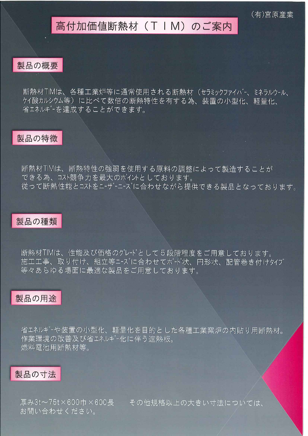 ・断熱材TIMは、各種工業炉等に通常使用される断熱材に比べて数倍の断熱特性を有します。・装置の小型化、軽量化、省エネルギーを達成することができます。・断熱材TIMは、...