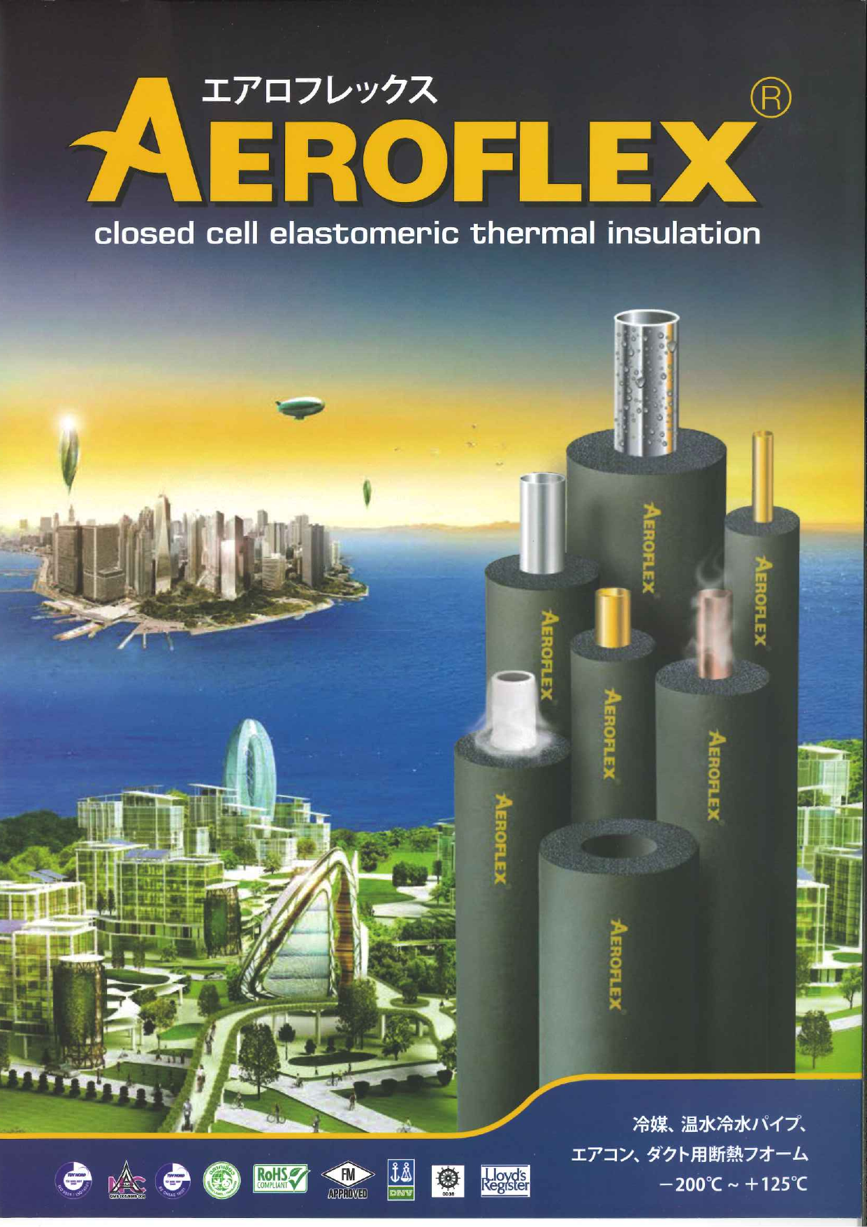 アルミテープ、ビニールテープ、アスファルト粘着剤など、湿気から守る為防湿材を必要としません。エアロフレックス両面の表皮と独立気泡の特質が、志腰痛の安定した熱伝導率...