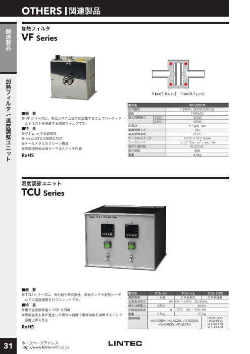 ◆加熱フィルタ VF SeriesVFシリーズは、気化システム後方に設置することでパーティクルやミストを除去する加熱フィルタです。・0.1 μ m のろ過精度。・Max200℃の加熱に対...