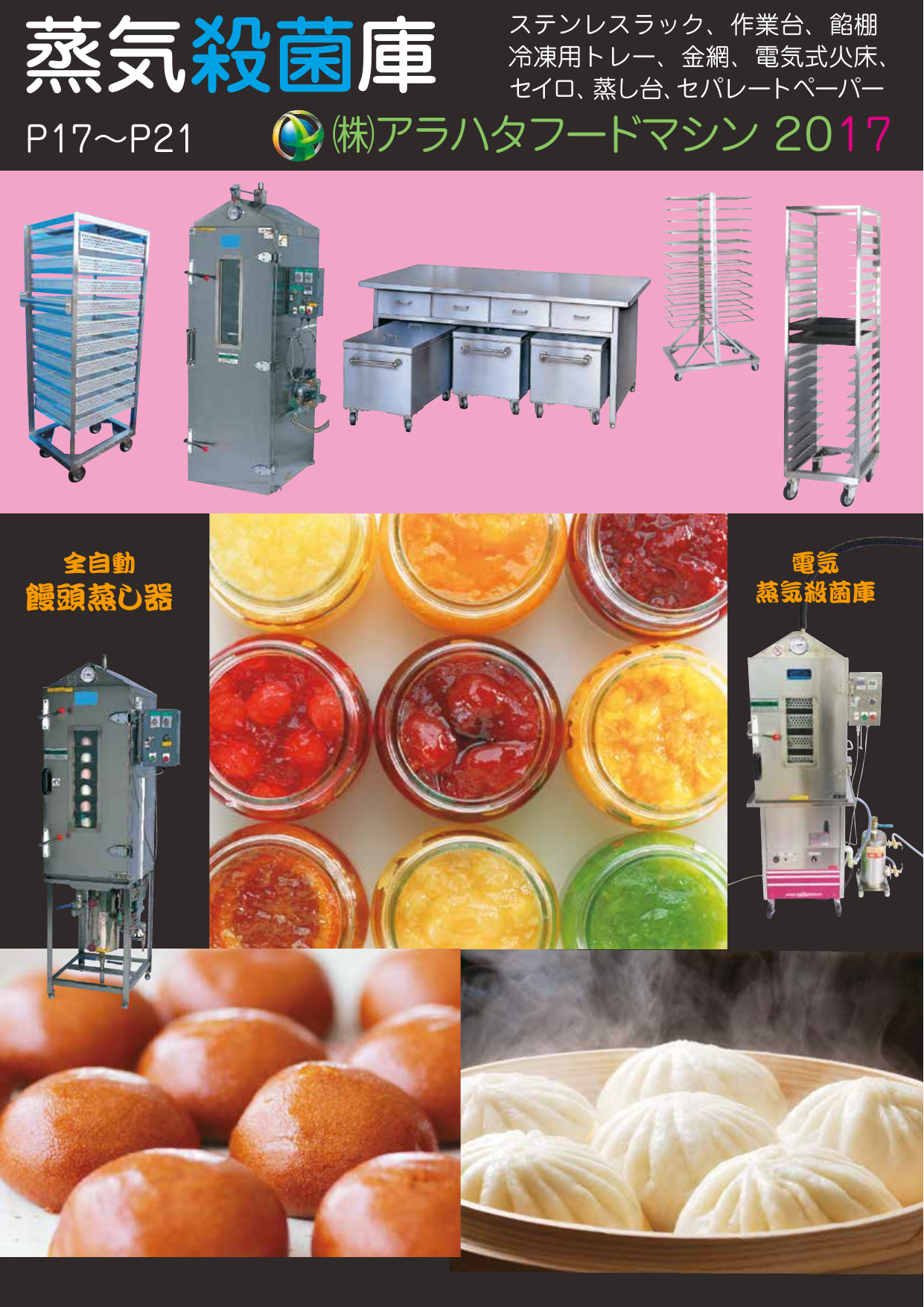 蒸気殺菌庫、ステンレスラック、作業台、餡棚、冷凍用トレー、金網、電気式火床、セ...