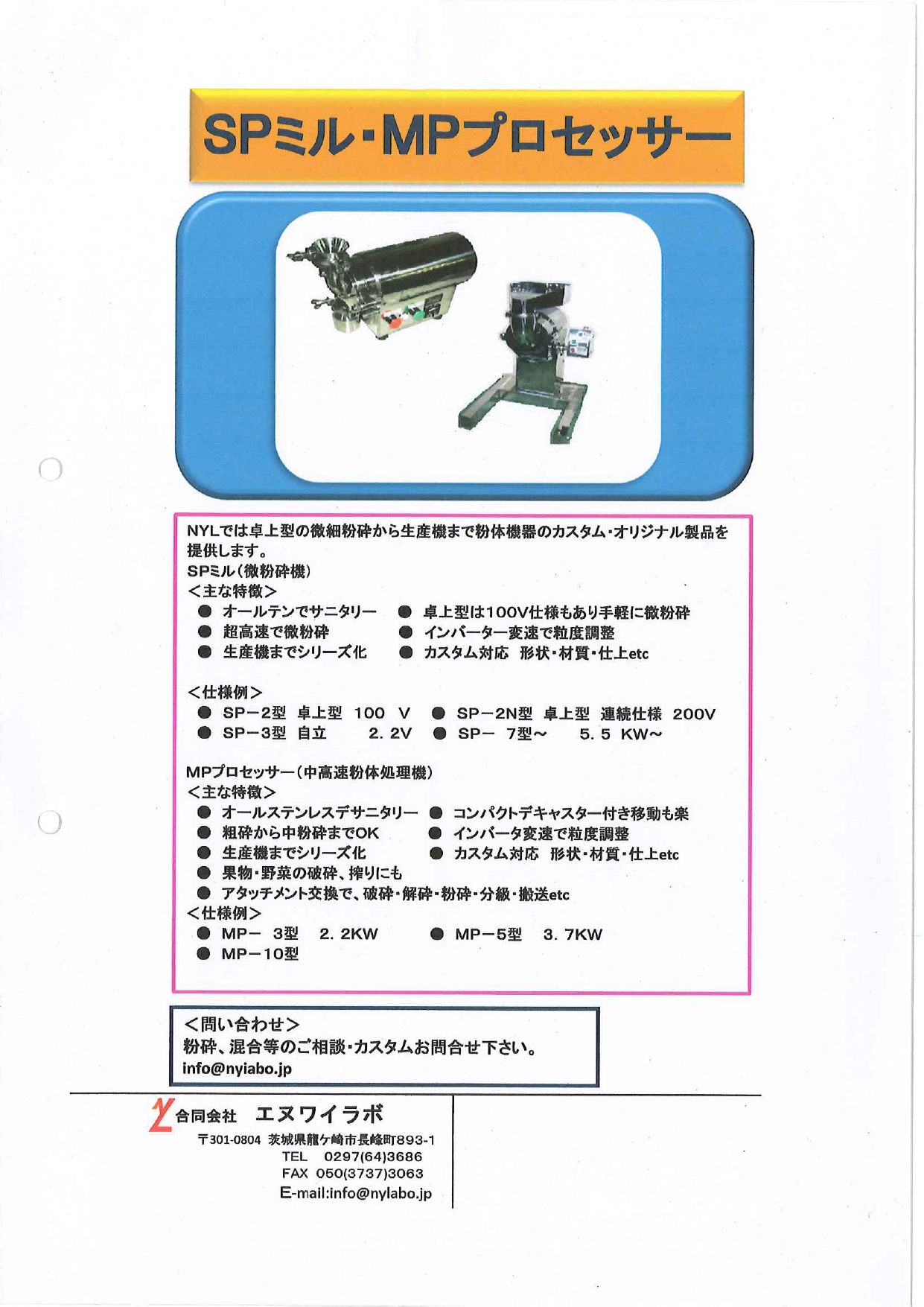 卓上型の微細粉砕から精算機まで粉体機器のカスタム・オリジナル製品を提供します。SPミル(微粉砕機)MPプロセッサー(中高速粉体処理機)