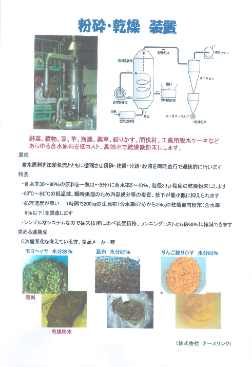 野菜、穀物、豆、芋、海藻、薬草、搾りかす間伐材、工業用脱水ケーキなどあらゆる含水原料を低コスト、高効率で乾燥微粉末にします。◆詳細はカタログをダウンロードしてご...