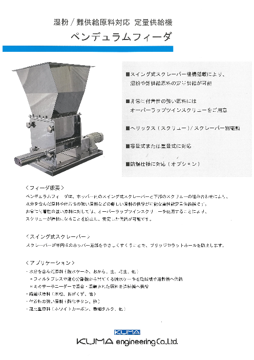 湿粉/難供給原料対応 定量供給機 "ペンデュラムフィーダ" カタログのご案内です
