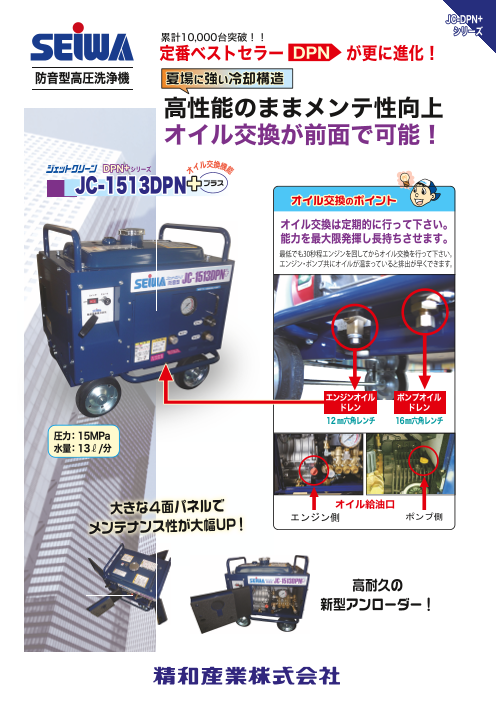 開放型高圧洗浄機 ポンプの全面改良により耐久性、総水量がアップしました
