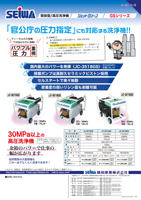 開放型高圧洗浄機 300キロのGSシリーズパワフル、圧力重視の300キロの大型洗浄機・国内最大のパワーを発揮(JC-3518GS)・ポンプは高耐久セラミックピストンを採用・セル...