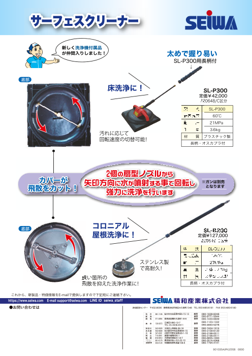 2個の扇型ノズルから、矢印方向に水が噴射することで回転し強力に洗浄・床洗浄なら、SL-P300 汚れに応じてかに点速度の切替が可能に・コロニアル洗浄に SL-B200 ステンレ...