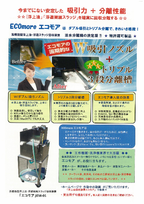 ★「浮上油」「浮遊微細スラッジ」を確実に回収分離する★・W(ダブル)吸引ノズル 浮上油・浮遊スラッジを、上手に吸引回収します。・トリプル3段分離槽 業界初の独自3段...