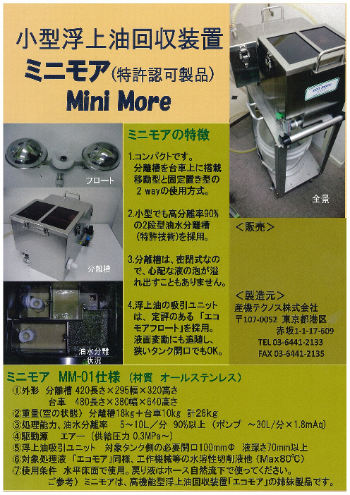 ミニモアは、高機能型浮上油回収装置「エコモア」の姉妹製品です。