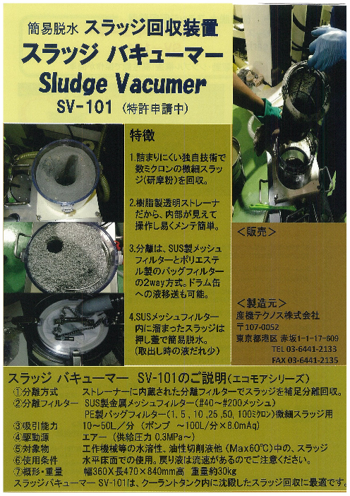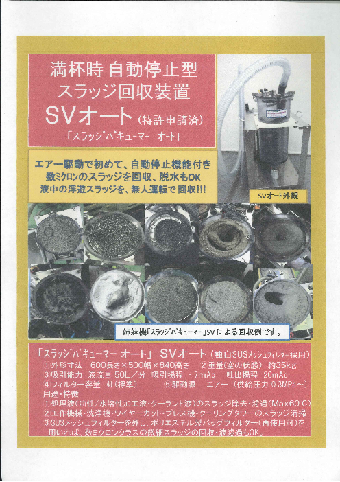 ・タンク内の浮遊・沈殿スラッジを急速回収。(アルミ、鉄、マグネシウム、鋳物、幅広いスラッジに対応。)・ストレーナー内に回収したスラッジから、簡単操作で水抜きできま...