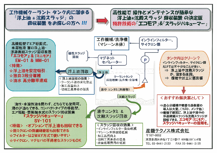 <浮上油回収の効果>・クーラント液の劣化防止・加工品質向上・切削工具寿命の延長<スラッジ回収の効果>・インラインフィルター負荷軽減・マシーン本体故障低...