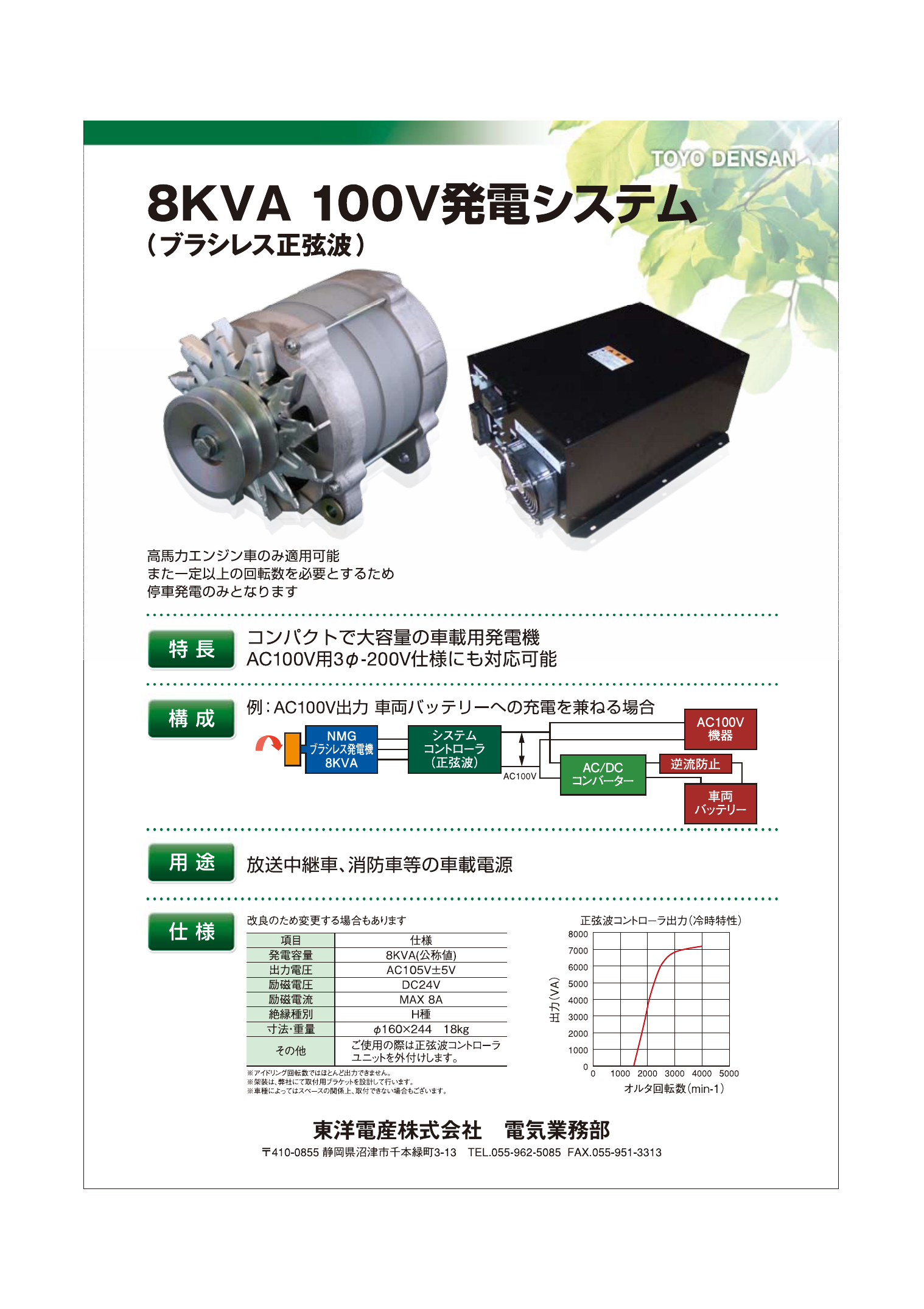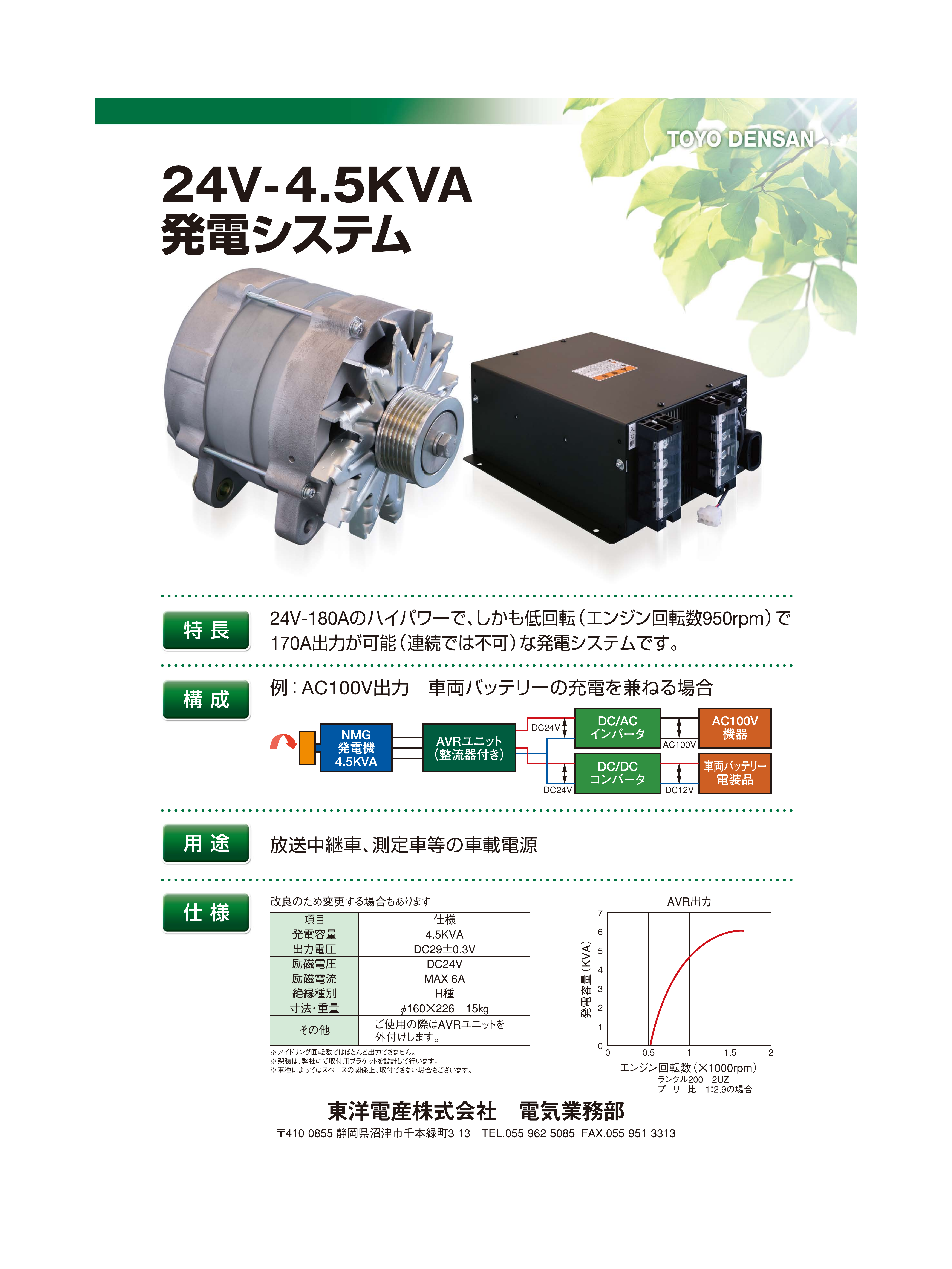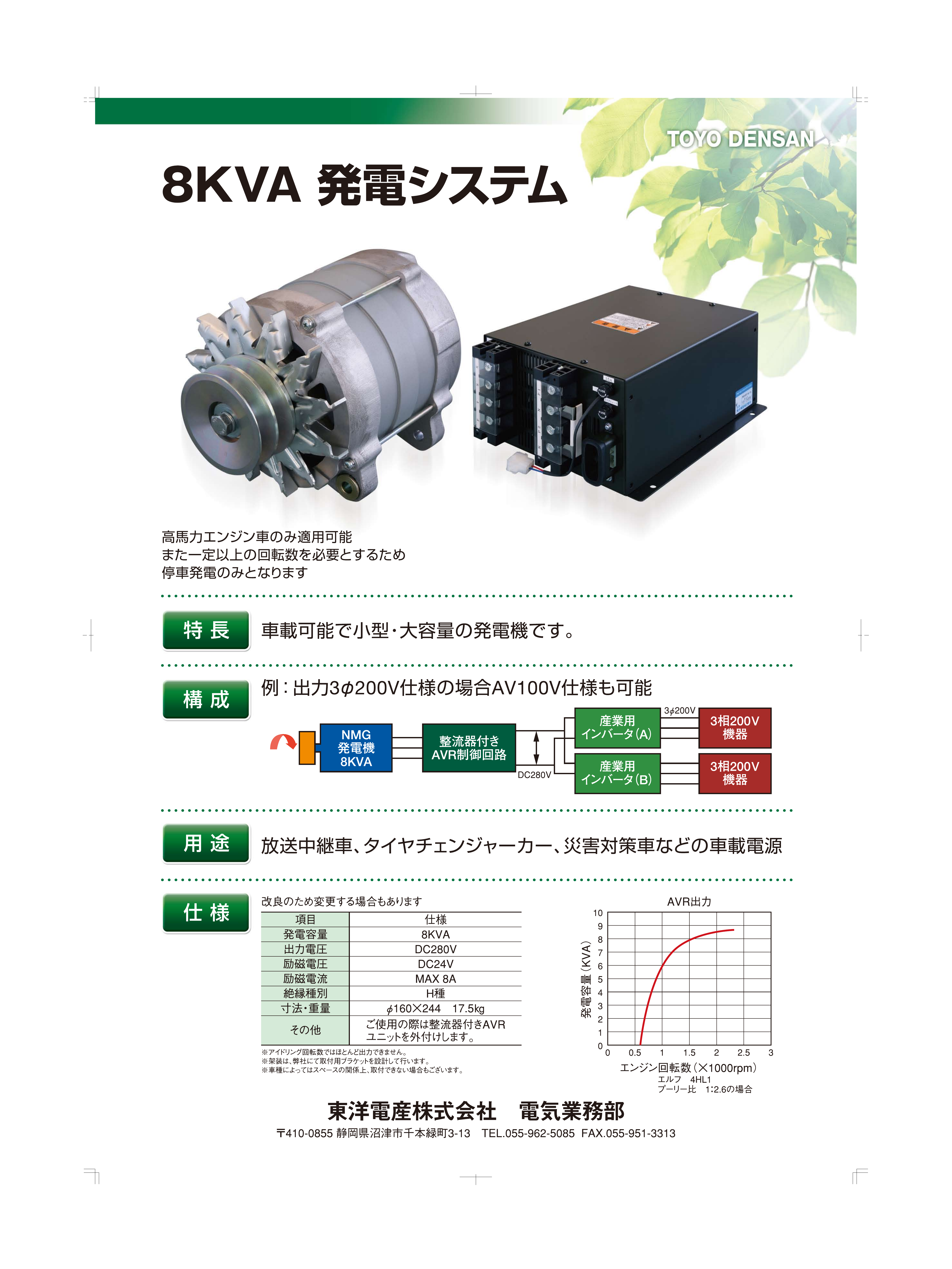 高馬力エンジン車のみ適用可能また一定以上の回転数をひつようとするため停車発電のみとなりますコンパクトで大容量の車載用発電機AC100V用3φ-200V仕様にも対応可能構成用...